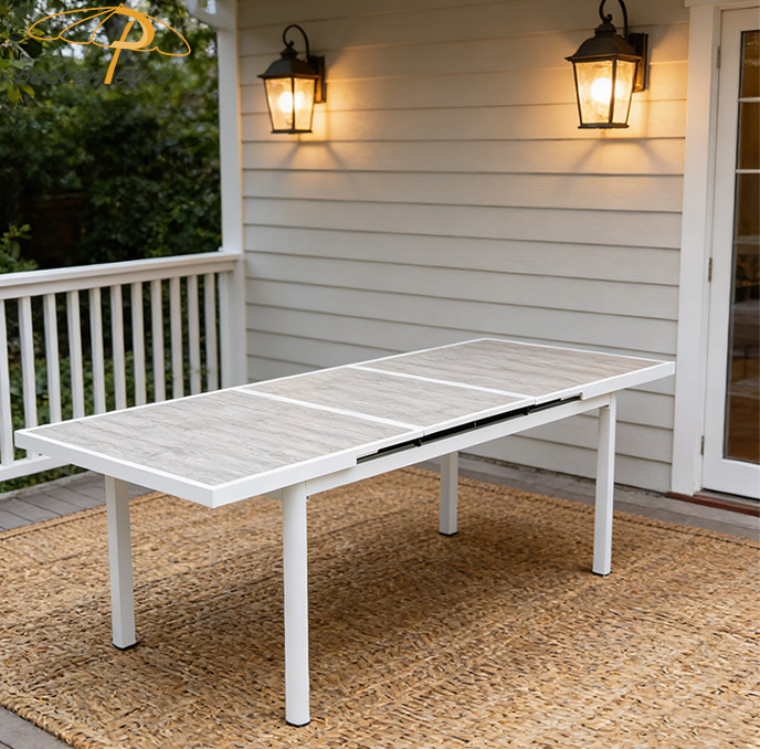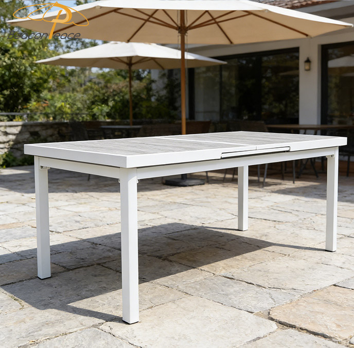This BP8522 extendable outdoor dining table features a powder-coated aluminum alloy frame paired with a poly-wood tabletop. The aluminum frame is rust-proof, corrosion-resistant, structurally stable, and highly durable, while the poly-wood tabletop authentically replicates the natural texture of wood while offering superior water resistance, weather resistance, and fade resistance. Its smooth extension mechanism allows for flexible adjustment of the tabletop size, effortlessly accommodating both everyday dining and larger gatherings. With its simple, sleek aesthetic, the table complements a variety of outdoor settings—such as courtyards and patios—making it an ideal choice for an outdoor dining table that combines both practicality and sophisticated style.