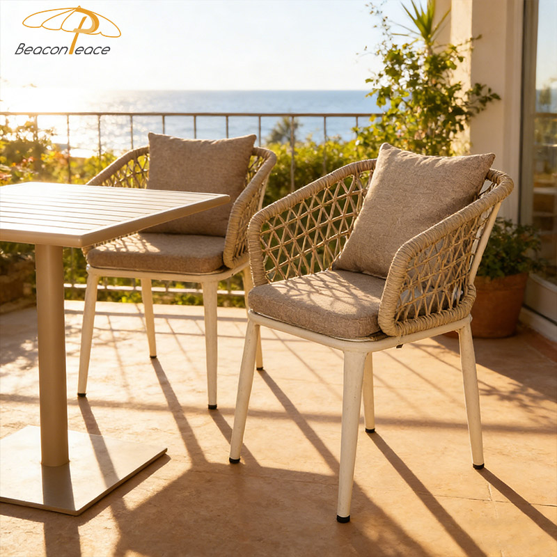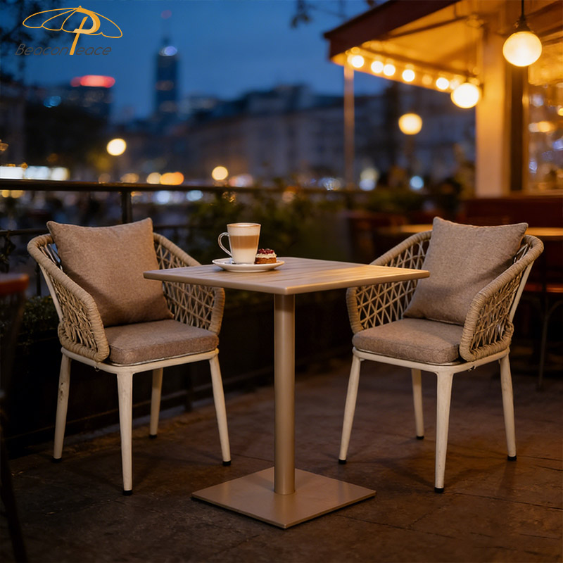 This BP1629&2041 outdoor three-piece set, consisting of one table and two chairs, features a lightweight yet sturdy aluminum alloy frame with excellent corrosion and rust resistance, ensuring long-lasting durability. The woven rattan backrest design is breathable, preventing stuffiness, and combined with soft cushions, provides exceptional comfort even during prolonged sitting. Its compact design is perfect for balconies or patios, adding a touch of comfort and practicality to your outdoor space, whether you're enjoying a light breakfast in the morning or a drink in the evening.