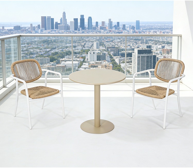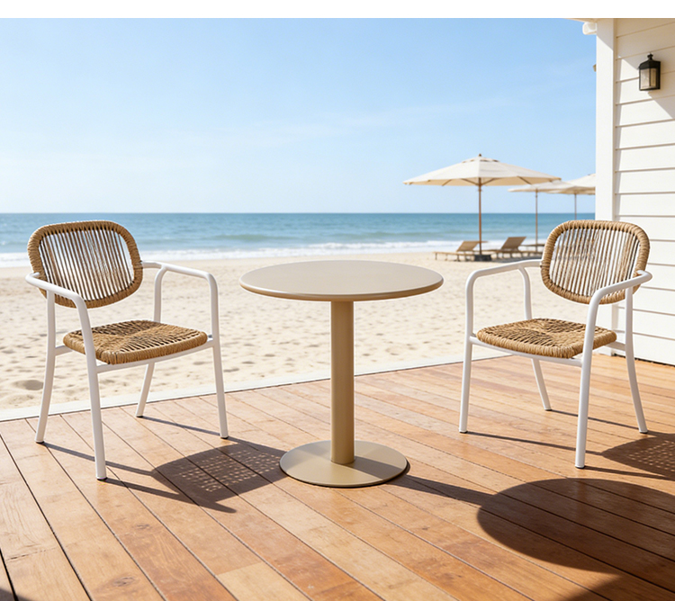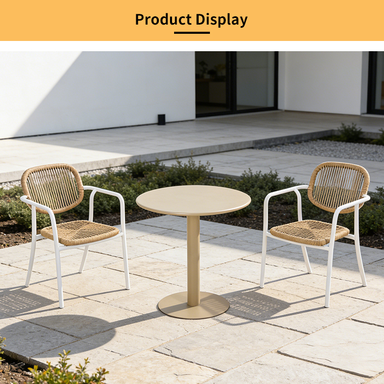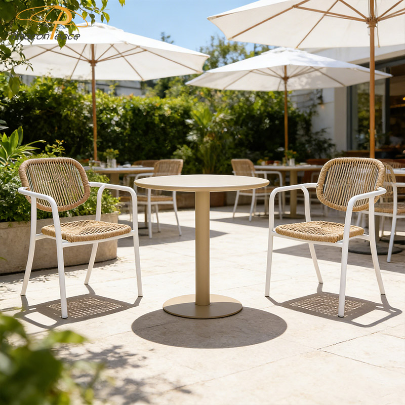 This BP4058&2158 three-piece outdoor dining set is ideal for outdoor restaurants and cafes. Made from high-quality aluminum alloy, it is lightweight yet sturdy and stable. The dining chairs feature PE rattan accents, adding a touch of style while providing a comfortable seating experience. The table is treated with an aluminum alloy coating, making it easy to clean and maintain, and suitable for various outdoor environments.