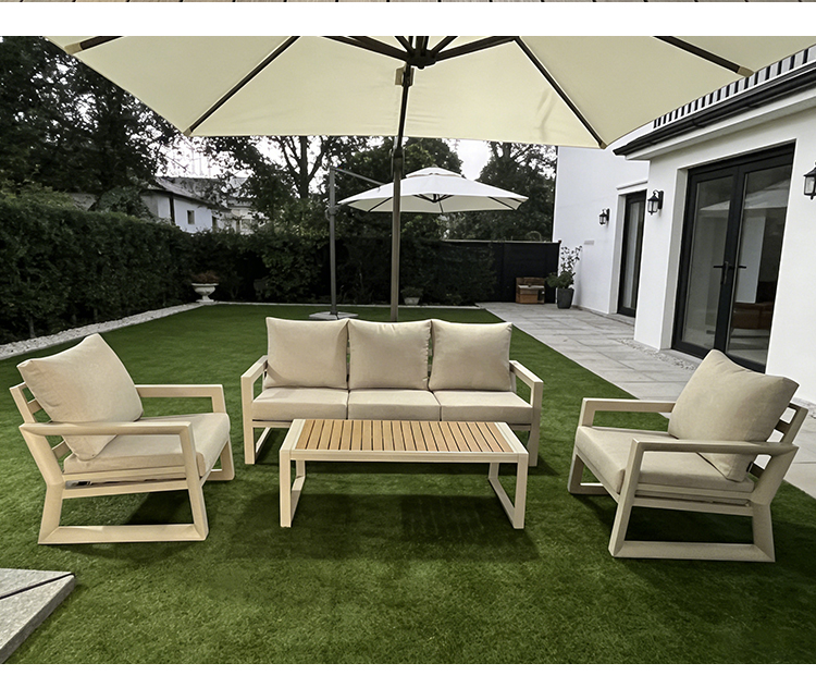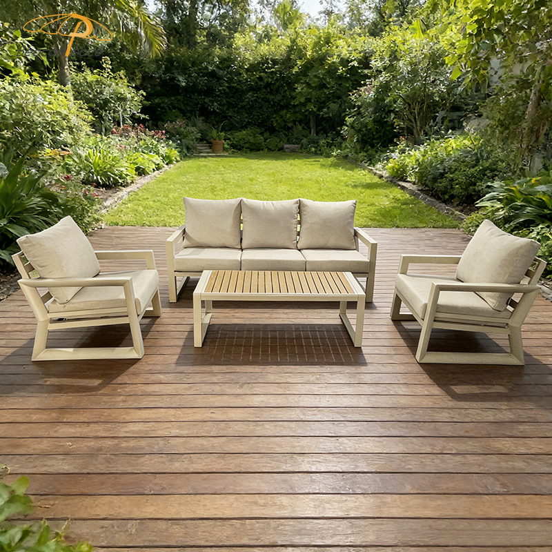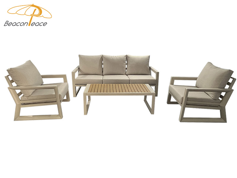 This BP8521 outdoor sofa set features a sturdy aluminum alloy frame that is corrosion-resistant, rust-proof, lightweight, and durable—standing up effortlessly to the rigors of outdoor sun and rain. The accompanying coffee table is topped with a high-quality poly-wood surface, offering a natural texture that is both wear-resistant and easy to clean. Complete with high-resilience, waterproof seat and back cushions, the set provides a plush, comfortable seating experience while remaining moisture-proof and weather-resistant. Easily adaptable to various outdoor settings—including courtyards, patios, and balconies—this set helps you create a durable yet comfortable outdoor leisure space that stands the test of time.